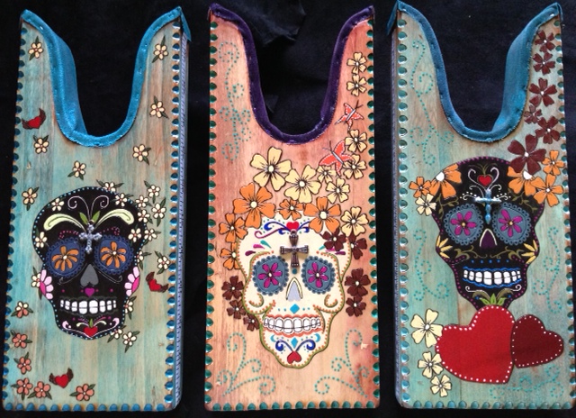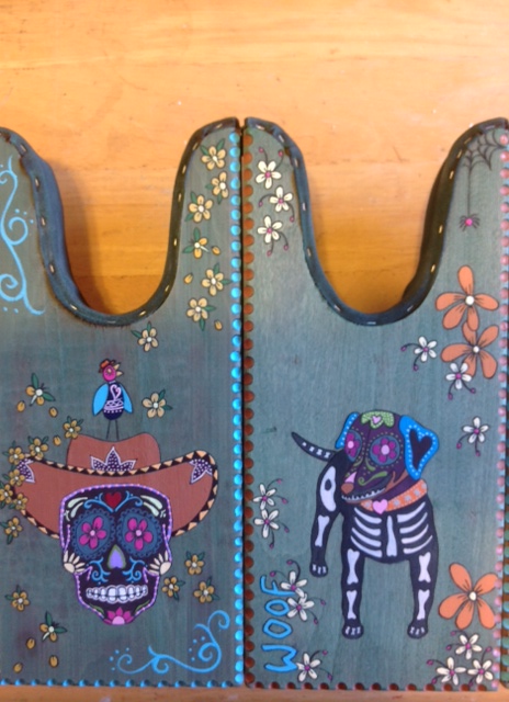 I wood burn the design first then paint these outrageously cool boot jacks. I stain some first, others I leave the natural wood color. They are all sealed and finished with a Marine grade clear varnish. Some have small cross charms , some have rhinestones; some have a tape measure down the sides, some have studs.